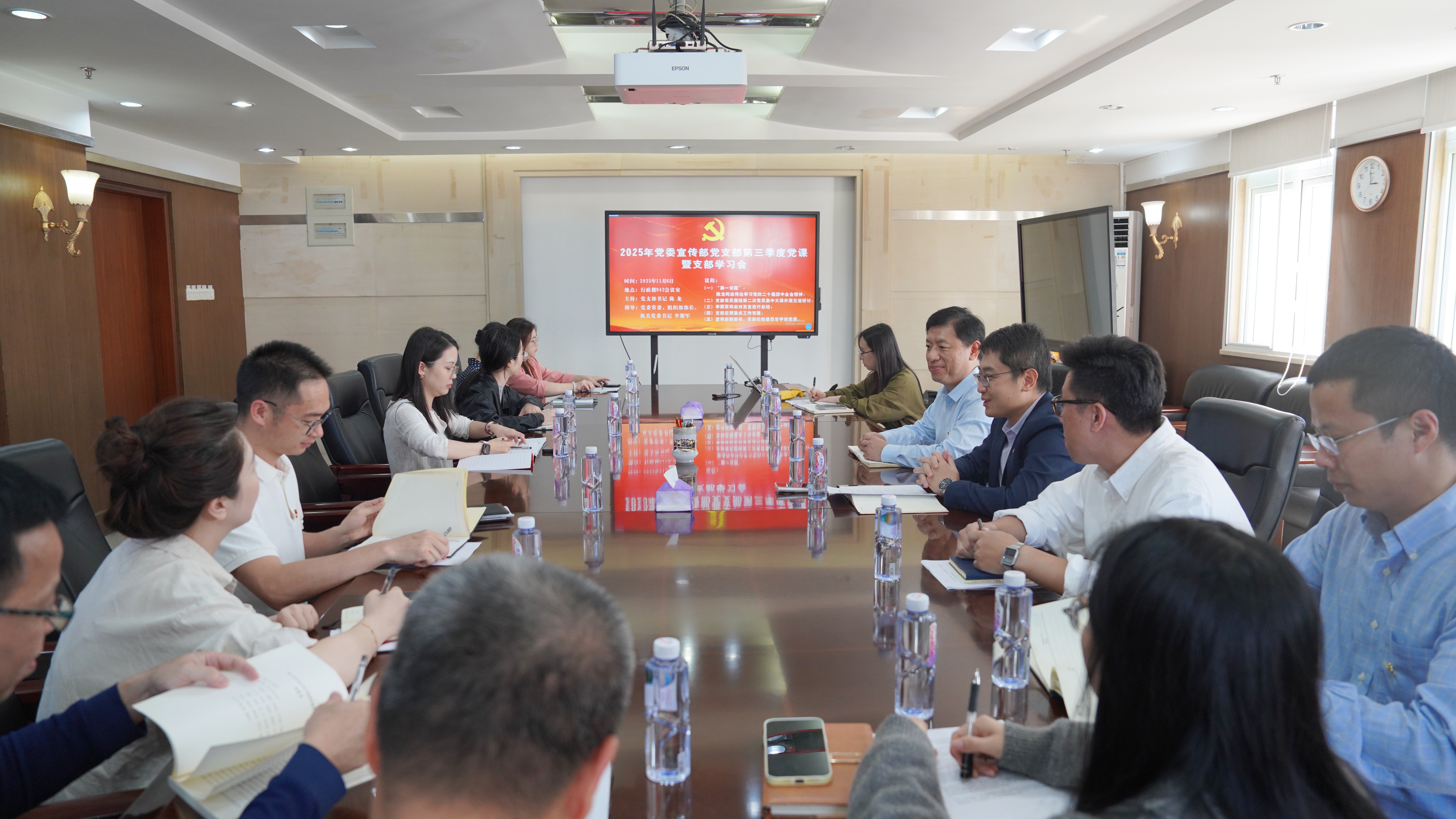 11月6日,暨南大学党委宣传部党支部召开党员大会,校党委常委、宣传部部长、支部书记陈龙领学党的二十届四中全会精神,宣传部副部长、支部纪检委员甘宇围绕“以习近平文化思想为指引 构建新时代大学文化育人格局”讲授主题党课,支部全体党员参会。校党委常委、组织部部长、机关党委书记李朋军列席指导。